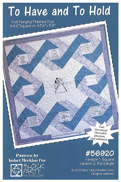 The To Have and To Hold pattern includes our “To Have and To Hold” panel. The pattern contains 2 versions – one is 44 ½" square and the other is 45 ½" X 59". Both have space to add pictures of the bride and groom, or pictures from the wedding. This pattern was designed by Isobel Meekins and is easy and fun to put together.